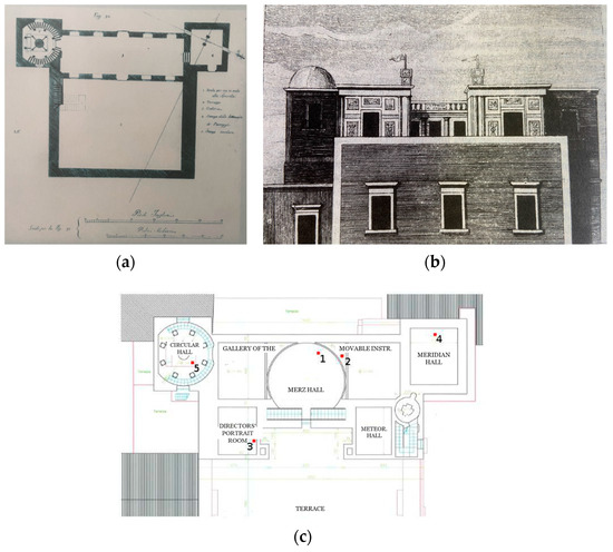 The Pisa Tower, the tallest and most robust structure of the entire Palace, was built at the behest of King Roger II in the 12th century. At the end of the 18th century, the tower was chosen as the optimal site for constructing the Royal Astronomical Observatory. The establishment of the Observatory was financed by Ferdinand III of Bourbon and entrusted to the Theatine mathematician Giuseppe Piazzi (1746–1826), who would become the future director of the Specola. The construction began in 1790 and was completed the following year. Originally, it included a large central gallery and two lateral rooms (the Ramsden Circle Hall and the Meridian Hall) (Figure 3a). In 1795, two lateral cubic foreparts (today’s Directors’ Portrait Hall and Meteorological Hall) were added, overlooking the large terrace [34] (Figure 3b). Over time, the building underwent numerous modifications and adaptations. In the 1990s, a comprehensive restoration was undertaken to repair the damage caused by the 1968 earthquake, giving the Specola its current configuration (Figure 2 and Figure 3c) [34].