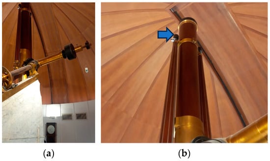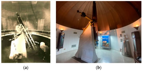 The Merz Hall, also known as the Refractor Hall, was built in 1865 at the highest point of the building, elevated above the Gallery (currently named the “Gallery of Movable Instruments”) (Figure 2b and Figure 3c). Access is provided by two staircases: one from the Directors’ Hall and one from the Meteorological Hall. It is surmounted by the largest dome of the Observatory and houses the Merz equatorial refractor telescope, from which the hall derives its name.