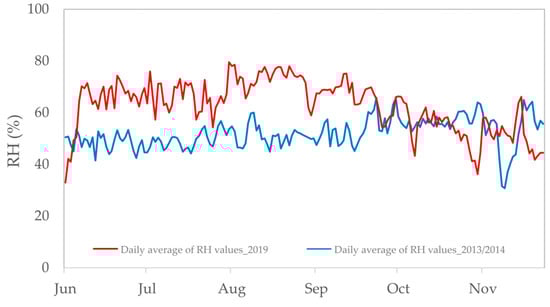 Comparison of the daily average RH values recorded between June and November for the 2013–2014 and 2019 series. It should be noted that between June and October 2019, the average relative humidity values (%) and the maximum daily fluctuations recorded inside the room were higher than those observed during the same period when the air conditioning system was inactive.