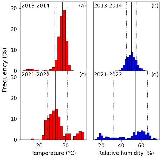 Comparison of daily mean temperature and relative humidity distributions in the Merz room during the periods 2013–2014 (a,b) and 2021–2022 (c,d). The continuous vertical lines are the median of the data for each distribution; the dotted vertical lines show the mean ± σ values.