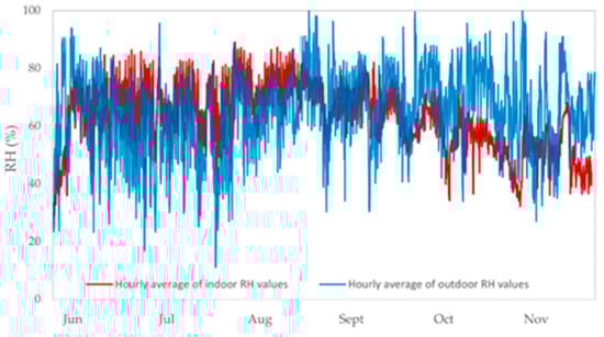 Comparison of the hourly average RH values recorded outdoors and indoors in 2019.