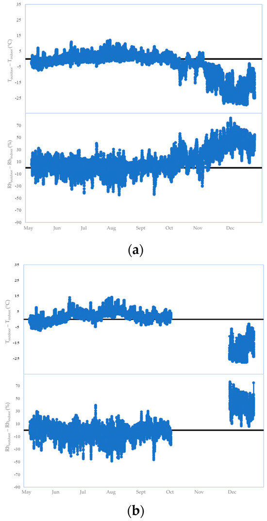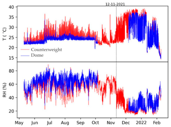 (a) Difference between the temperature and the relative humidity inside the dome and the external values. (b) Difference between the temperature and the relative humidity values recorded in the lower part (counterweight) and the external values. Up until October 2021, indoor values followed the outdoor trends. Starting in November, the pattern shifted with indoor T values consistently higher and RH values lower than the outdoor ones. The gaps in the graphs are due to sensor battery failures.