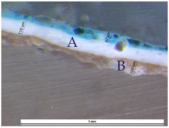 The cross-section of a sample with traces of blue pigment, observed under optical microscopy, revealed two ground layers: a compact white layer beneath the paint layer, and another one, less brilliant and less compact, directly applied to the wood (Figure 12). The layers appeared well-adhered and cohesive. Figure 12 shows the thickness of each layer.