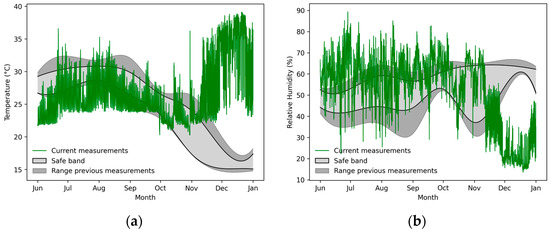 An even more dangerous trend in RH was recorded in Merz Hall from November 2021 onwards. The data presented in Figure 10 reveal that between November 2021 and February 2022, the temperatures in the Hall were unusually high, ranging from 35 °C to nearly 40 °C. This indicates that the air conditioning system overheated the environment, most likely due to a failure. This resulted in a drop in relative humidity, frequently to dangerously low levels, well below 40% for several days. During this extended period of low RH, the Model suffered critical failure.