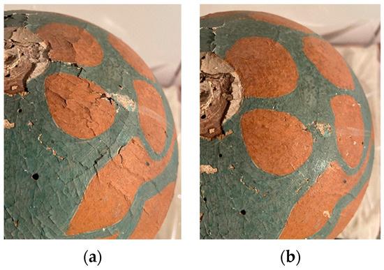 These operations ensured the preservation of the object in its authenticity and saved all original paint fragments that had lost cohesion and adhesion (Figure 18a). Visible traces of a probable protective layer applied to the upper half of the Model (Figure 18b) were not removed on this occasion to allow for future analysis of the object and its conservation history.