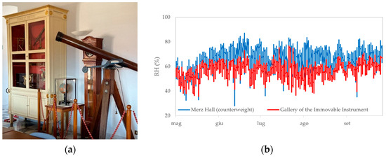 (a) Current location of the Model of Mars protected by the temporary display case in plexiglass in the Gallery of Immovable Instruments; (b) comparison of RH trends in the Merz Hall and the Gallery of Immovable Instruments in 2021.
