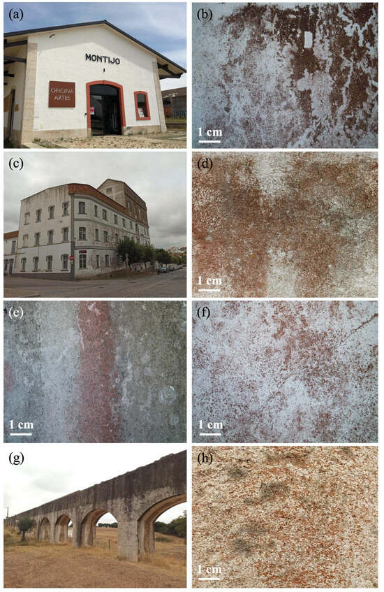 The four buildings affected by biological patina and the objects of this study: (a,b) Ancient train station (Montijo, Portugal) and red patina affecting the building. (c,d) Old grinding factory and red patina affecting the building (Arraiolos, Portugal). (e,f) Snapshots of red biological patina affecting an ancient private house in Alcochete (Portugal). The building is not shown for privacy reasons, (g,h) Ancient aqueduct (Évora, Portugal) and relative red patina.