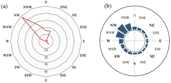 (a) Cardinal exposition of the wall stained by the red patina. A total of 120 buildings located in the villages of Sesimbra, Alcochete, Montijo, Alcacer do Sal, Setubal, Fatima, Caldas da Rainha, Évora and Arraiolos were considered for the observations; (b) direction and frequency of the winds in the study areas.