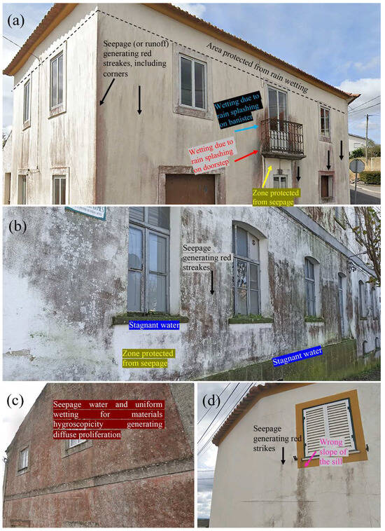 Practical cases of bio-colonization as markers of building pathologies: (a,c,d) private houses, (b) old grinding factory (Arraiolos), sampling location of the specimen L2.