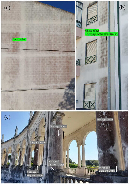 Practical case of bio-colonization as markers of building pathologies: (a,b) private buildings, (c) colonnade at Fatima’s sanctuary.