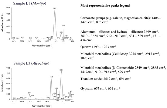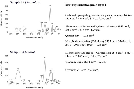 Other inorganic compounds are present at 674 cm−1 and 655–661 cm−1, which are the frequencies representing the gypsum [33]. Sulfates probably come from the marine aerosols in the Montijo and Alcochete villages. Sulfation of the carbonate-based painting can occur in the varnish of the Évora aqueduct.