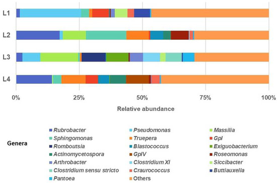 The heat map for the prokaryotic populations (Figure 8) shows the top 58 abundant genera in the bacterial communities of the L1, L2, L3, and L4 samples. The four samples present distinct relative abundance profiles. The relative abundances of the genera Gp16, GpXIII, Actinomyces, Rubellimicrobium, GpIV, Actinoplanes, Asticcacaulis, Solirubrobacter, Planomicrobium, Salmonella, Nitrolancea, and Actinomycetospora are significantly higher in sample L1 (Montijo). The relative abundances of the genera Clostridium_XI, Clostridium_sensu_stricto, Psychrobacter, Romboutsia, Pantoea, Exiguobacterium, Escherichia_shigella, Erwinia, Arthrobacter, Massilia, Bacillus, Enterobacter, and Acinetobacter are significantly higher in sample L2 (Arraiolos). The relative abundances of the genera Sphingobium, Roseomonas, Sphingomonas, Chlorophyta, Heliothrix, and Brevundimonas are considerably higher in sample L3 (Alcochete). The relative abundances of the genera Stenotrophomonas, Pseudomonas, Kluyvera, Raoultella, Sanguibacter, Citrobactrer, Siccibacter, Luteimonas, Geminicoccus, Euzebya, Promicromonospora, Buttiauxella, and Aquisphaera are significantly higher in sample L4 (Évora).
