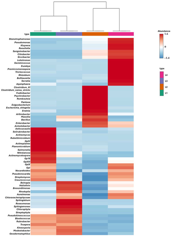 Heatmap analysis of the genera’s relative abundance of every genus level based on the bacterial community 16s rDNA sequence, according to the average frequency of samples L1 (Montijo), L2 (Arraiolos), L3 (Alcochete) and L4 (Évora). Red and blue colors show the high and low enrichment of a genus, respectively. The scale represents normalized abundance values, where positive values indicate abundances above the mean and negative values indicate abundances below the mean relative to the dataset. These differences are visually represented by the color intensity on the heatmap.