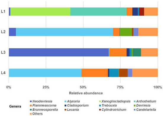 The analysis reveals differences in the relative abundances of fungal genera across the samples (Figure 9). The genera Caloplaca, Flavoplaca, Rinodina, Trebouxia, Vermiconia, Verrucaria, Incertomyces, and Lecania are dominant in sample L1 (Montijo). Among these, certain genera like Caloplaca and Verrucaria are known to include lichen-forming species capable of producing carotenoids and other pigments contributing to red or orange biofilm pigmentation [46,47].