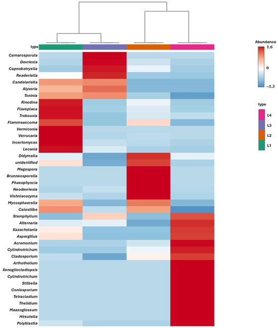 Heatmap analysis of the species relative abundance of every genus level based on the eucarya community ITS2 sequence, according to the average frequency of samples L1 (Montijo), L2 (Arraiolos), L3 (Alcochete), and L4 (Évora). Red and blue colors show the high and low enrichment of a genus, respectively. The scale represents normalized abundance values, where positive values indicate abundances above the mean and negative values indicate abundances below the mean relative to the dataset. These differences are visually represented by the color intensity on the heatmap.