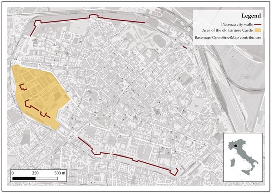 In recent decades, the rediscovery of Piacenza’s military and architectural heritage has provided insights into the city’s history. Research has focused on the Farnese Castle, also called Farnesian Citadel, which is part of the wider context of the city walls and has led to a greater awareness of the historical architectural heritage, which is little known to the citizens. In fact, the remains of the ancient pentagonal site, dating back to the XVI century, are located in the western part of the city, within the boundaries of the Polo di Mantenimento Pesante Nord of the Italian Army, a military area where access is restricted to authorised persons or to special occasions. Figure 1 shows the location of the study area and highlights the position of the parts of Piacenza’s walls that still exist today. As can be seen from the map, only three of the original five bastions remain, together with a curtain wall connecting two of them.