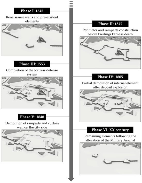 Based on available documentation, the process of evolution of the defensive elements of the city of Piacenza that mark the history of the Farnese Castle can be schematised in 6 phases shown in Figure 2.