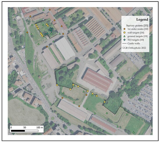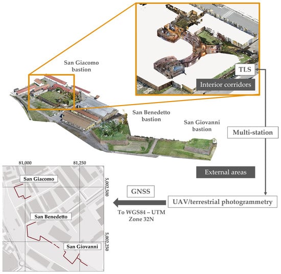 Orthophoto of the case study area with the survey points. The 1st order nodes of the topographical network represent the positions of the stations from which measurements were taken with the total station of the targets on the ground and on the walls of the structure. Ground targets were also measured with a GNSS receiver. Inside the San Giacomo Bastion a set of additional targets was used to interlink the indoor TLS scans.