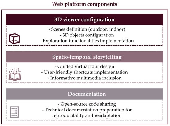 The third step of the methodology consists of the implementation of a user-friendly web platform based on open-source technologies for virtual exploration and dissemination of the CH site. In particular, the developed prototype is based on 3 different components (Figure 7) in order to create an accessible virtual interactive experience for both technicians familiar with geomatics products as well as simple users interested in the history of the CH site.