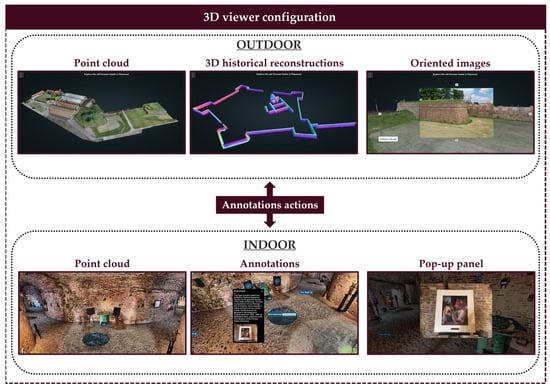 In order to include other georeferenced multimedia and informative objects in the viewer, two distinct scenes are then defined (Figure 8): the outdoor one to exploit the visualization potential at the entire CH site scale, and the indoor one for the exploration of the more detailed environment inside the surveyed castle rampart. This choice is motivated by the need to subsequently define specific storytelling strategies at different scales, as well as to ensure optimized computation and rendering of 3D objects by efficiently regulating their visibility on the screen.