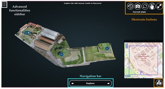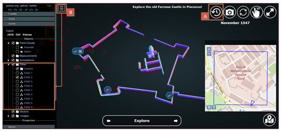 In particular, six main buttons are included in the main GUI, providing the users with easy access to interactive functionalities. Some of them allow users to enter full-screen mode, make the navigation instructions panel visible or reload the page. Other custom buttons make it possible to show a small OpenStreetMap map highlighting the position of the bounding box of the loaded scene and to change the visibility of the oriented images in the outdoor scene. A special storytelling function is provided by the “rewind” button, which, through successive clicks, changes the visibility of the 3D objects—either point clouds or meshes—showing the evolution of the Farnese Castle complex from 1547 to the present day. To make it easier to understand this functionality, each click is associated with the appearance of a dynamic text on the right-hand side of the screen with the name of the historical phase represented by the model being displayed.