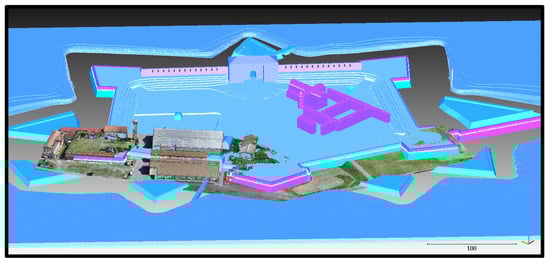 The 3D digital reconstruction of the construction phases resulted in a series of nine meshes representing the evolution of the Castle according to the original plans and maps of Piacenza. This series of 3D objects included both the states of the site corresponding to the main historical phases depicted in Figure 2 as well as additional models with intermediate structural changes reported in the literature and old maps. The originally designed proportions of the bastions and curtain walls were maintained due to the lack of quantitative information on changes during construction. The models were georeferenced into the WGS84/UTM Zone 32N reference system by manually collimating peculiar features (e.g., bastion corners) visually recognizable both in the historical and in the UAV point cloud (Figure 10).
