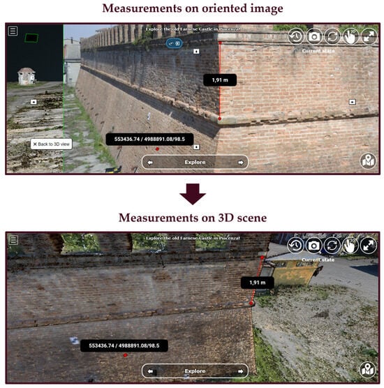 The implemented 3D web viewer, currently hosted on the authors’ laboratory server, serves as the main platform where users can retrieve both historical and metrical information. It provides simplified access to accurate 3D georeferenced data and makes it possible to explore it with simple mouse clicks. In particular, it supports the navigation and multi-level evaluation of the CH site. By integrating different formats of 3D data, it allows the exploration of their functionalities for different types of audiences. For example, oriented images of the outdoor scene help users unfamiliar with 3D products, such as point clouds, to navigate through the current state of the site. At the same time, they provide a georeferenced visual record of the condition of the site at the time of the survey, giving experts in the field valuable insight into the structural health assessment of the castle. Experts can easily identify defects or damages with a virtual visual inspection and then annotate them—extracting their coordinates—and measure their extension on the structure, obtaining quantitative observations on their level of severity. Such operations are made possible by the fact that the orientation parameters associated with the images allow a clicked point on the 2D object (single picture) to be automatically associated with a specific triplet of coordinates in the 3D scene in which the point cloud is located (Figure 11).