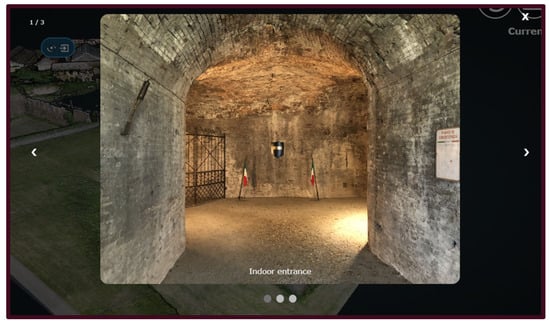 In addition, native Potree annotations provide a double functionality in support of a user-friendly and enjoyable 3D scene exploration. First, they enrich the storytelling of the site, giving users additional historical and cultural context with custom pop-ups containing images, texts, slideshows, and external links for in-depth studies of objects inside the scene (Figure 13). Second, annotations provide reliable anchor points for users who, if lost in free navigation of the scene, can click on one of them to return to pre-established virtual tours (Figure 14). The inclusion of actions to activate camera animations and toggle the visibility of objects in the scene also encourages users to explore the site more interactively, defining a treasure hunt-like experience to discover all the hidden elements in the Castle.
