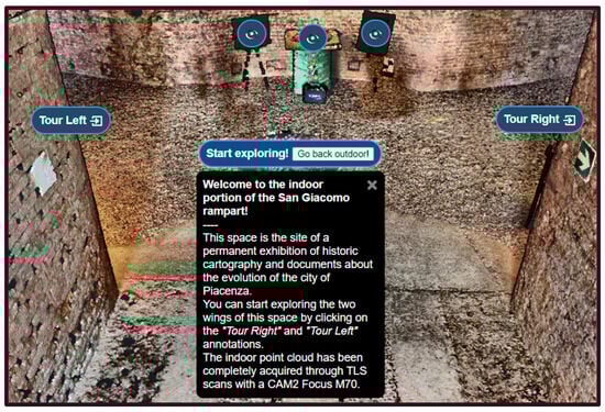 The indoor scene contains a point cloud representing the 3D interior environment of the inspected rampart. Such a georeferenced product serves as the starting point for inserting annotations in the scene to support user navigation. By clicking on them, users can start the exploration with guided camera views of objects or artefacts of interest in the indoor environment. Moreover, each annotation is associated with a descriptive multimedia panel that contains additional information on the historical or cultural context of the linked element. Alternatively, a dedicated fixed pop-up appearing on the scene can be associated with chosen annotations, highlighting particular elements.