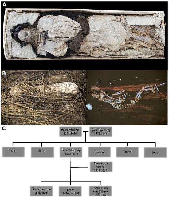 (A) Mummified body of bishop Peder Winstrup in his coffin; (B) the bundle containing mummified remains of the fetus and a CT scan image of the contents; (C) genealogical reconstruction of Peder Winstrup’s family tree. Images adapted from [].
