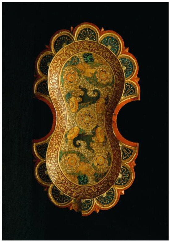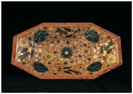 In 2007, a “Turkish” barniz de Pasto chest (Figure 12, inv. no. 2007/04/01) was acquired from the antiques dealer Susana Montiel-Colmenares; it had been found in 1961 on the London art market in the shop Gabor Cossa Antiques, where it had been catalogued as having been made in Turkey. This is a small wooden cabinet with a barrel-vaulted lid; it rests on spherical feet; it has a drawer on the left side and two more at the bottom; the inside of the lid and the compartments are lined with very worn red velvet; it has the original lock made of silver. As for its decoration, it has the characteristics of belonging to the barniz de Pasto brilliante variant, due to the insertion of silver leaf between the sheets of varnish to produce a very characteristic shiny and iridescent effect. Also, due to the ornamental repertoire based on flowers and birds, the piece was dated to the second half of the 17th century.