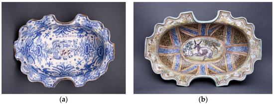 On one hand, there is a twice-indented concave bowl with a flat brim and lobed profile (Figure 1, inv. no. 12242), which measures 43 cm in length and 24.5 cm in width. It is decorated with flowers, birds, and fantastic animals, and was first mistakenly catalogued as originating from Mexico. It is now catalogued and displayed with the geographical location of ‘Real Audiencia de Quito. Viceroyalty of Peru. Present-day Colombia.’ The bowl was dated back to the 19th century, although a comparative analysis with other similar barniz de Pasto items, as well as ceramic pieces from Talavera de la Reina (Figure 2a,b) and Asian porcelain of similar format and iconography, allowed for its origin to be recorded as the 17th century.