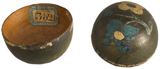 The bowl decorated with barniz de Pasto in a grid pattern (Figure 4a,b, inv. No. 12304) also comes from the Museo de América’s founding collection, and, thus, from the former collection of the Ethnography Section of the National Archaeological Museum. It has a diameter of 15 cm and was originally catalogued as originating from Peru, although there were no further details in its documentation. In fact, that it is an item with barniz de Pasto has only been verified in recent years, due to it being studied meticulously and in detail. As for the item’s decoration, the exterior exhibits ornamentation of a circle at the centre and orange-coloured flowers, as well as other plant elements and blue and golden birds along the surface7. The interior shows the varnish in its pure colour, whilst the background was shaped by hand in such a way that it shows a grid of small squares, which has been, until now, an unknown ornamental motif in the field of barniz de Pasto. This could suggest the participation of a different kind of workshop for a new technique.