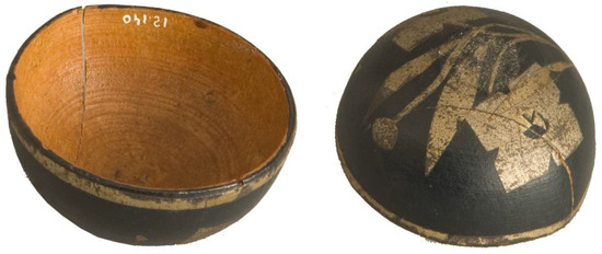 Among the objects with barniz de Pasto that Gutiérrez de Alba donated are five gourds with barniz de Pasto from Timaná (Figure 6, Figure 7, Figure 8, Figure 9 and Figure 10, with inv. nos. 12108, 06965, 12130, 12139 and 12140). They belong to a type of vessel typical of the natives from the Pasto region. They were made using the hard shell of gourds, either carved by hand or with turning tools. In other similar objects, made from gourds but not decorated with barniz de Pasto, it has been noted that the manufacture was reserved for women. The procedure, which has a long tradition, entailed burying the gourd in order to accelerate the pulp’s decomposition and facilitate its extraction with the use of scrapers. The gourd shell would then be hardened by being repeatedly heated. Thus, in these small objects with simple decorations, the survival and continuity of pre-Hispanic techniques can be seen, as well as ornamental repertoires through the viceregal period, right up to the 19th century.