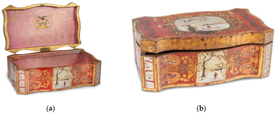 As mentioned above, one of the aims of this article is to present the Museum’s latest acquisitions of Barniz de Pasto objects as part of the desire to enhance the institution’s museological and scientific collections of art and decorative arts from the viceregal period. Firstly, in June 2022, the State acquired, at the auction held on the 30th March of the same year at the Alcalá auction house (C/Núñez de Balboa 9, 28001 Madrid), for 1200 EUR and destined for this Museum, a small wooden chest with barniz de Pasto (Figure 14a,b, inv. no. 2022/07/01), made of cedar wood, measuring 21 × 20.5 × 36.5 cm. The box has a mixtilinear profile, based on curves and counter-curves with flat-edged corners, no feet, and a flat lid at the top that opens and is held in place by two metal hinges; the metal lock does not seem to correspond to the one it must have originally had; the interior is divided into two parts of different sizes. The smaller part, located on the right-hand side and divided into two shelves, contains a secret drawer underneath.