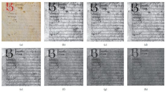 (a) Photography of Parch. 38 belonging to the collection of the Library of the Department of History, Anthropology, Religions, Art History, Media and Performing Arts of Sapienza University of Rome; MSI with a UV source and filters at (b) 470 nm; (c) 500 nm; (d) 532 nm; (e) 600 nm; (f) 680 nm; (g) 700 nm; and (h) 750 nm. Reproduced under the terms of Creative Commons Attribution License 4.0 from [6].