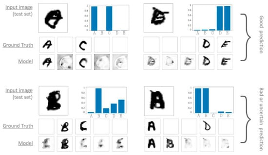 Examples of the prediction of a semantic segmentation model applied on a synthetic dataset of overlapping handwritten letters. In the top panels is the segmentation of complex combinations of A + C and D + E; in the bottom panels is the segmentation of complex combinations of B + C and A + D. To enhance visualization and explore potential patterns in noise residuals, the authors employ a min–max scaling technique for the color palette representation of predicted segmentation masks. Consequently, white pixels in each panel indicate zero flux, while black pixels represent the maximum flux in the mask. To facilitate a fair comparison between different masks and identify significant signals amidst noise residuals, histograms illustrate the distribution of maximum fluxes in each panel. Reproduced under the terms of Creative Commons Attribution License 4.0 from [32].
