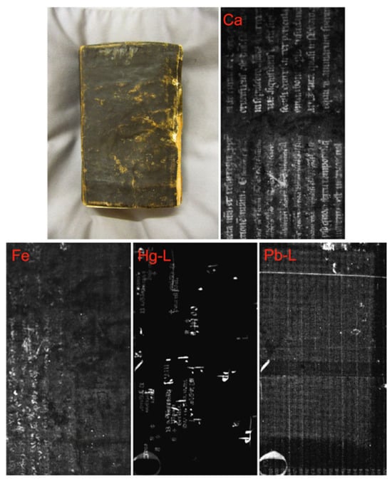 X-ray fluorescence (XRF) is one of the most used techniques for the characterization of inks in manuscripts [33,34,35]. Although the technique is not sensitive to materials with low atomic numbers (for example carbon ink), it has been revealed to be suitable for the detection of iron-based materials, i.e., iron gall ink, and pigments composed of chemical elements with medium/high atomic numbers (i.e., mercury, lead, and copper). The development of high-performing scanning systems has enabled us to carry out macro XRF (MA-XRF) imaging, discovering hidden texts on the basis of their elemental composition [36,37,38,39,40,41]. MA-XRF imaging has proven to be a successful approach when dealing with books made from recycled parchments that have suffered from darkening (Figure 3). Since iron-based inks were the most used writing materials during the Middle Ages [42], MA-XRF could map iron and other elements constituting the inks (e.g., calcium, zinc, copper, and manganese) for reconstructing the text, without any mechanical treatment of the books. This is possible because the support materials (i.e., parchment, papyri, and paper) are completely transparent to X-rays.