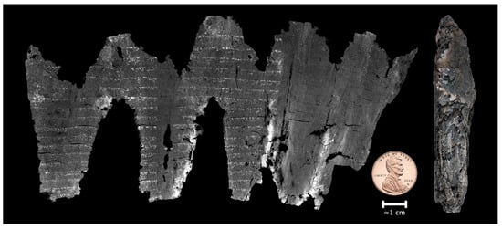 In XCT, the image contrast mechanism is based on differential X-ray absorption within a compound object. Micro-computed tomography (micro-CT or micro-XCT) is a variant of XCT that generates significantly higher-resolution images of objects. One of the main experiments in the field is the first “virtual unwrapping” of the En-Gedi scroll, one of the oldest Hebrew Pentateuch scrolls [46]. The ink composition, which likely contains metal, has a density that can be detected using micro-CT. This technique enables the reading of text that is concealed within the charred scroll (Figure 4).