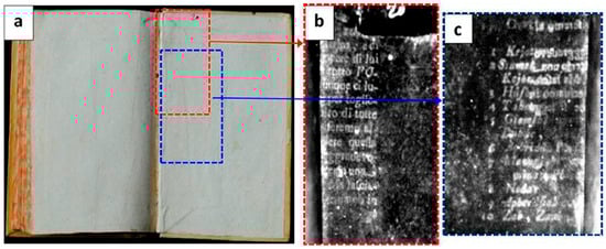 Photoacoustic imaging applied to hidden text is a new research frontier. This technique is based on the absorption of pulsed light (i.e., laser sources) by a material, which determines the thermoelastic expansion of the surrounding environment and, consequently, a rapid pressure variation. The latter effect spreads as acoustic waves [82]. In the field of imaging applied to cultural heritage, the frequency range of the detected photoacoustic signals is in the ultrasonic interval (from a few up to several tens of MHz). As already demonstrated by the technologies that do not use visible light as a source, the main advantage of this technique is to provide high optical absorption contrast in an opaque matrix. Photoacoustic imaging takes advantage of light scattering, which enables the excitation of a broad volume, independent of the directions of the interacting photons [82]. Photoacoustic imaging has been demonstrated to be a good tool for the individuation of subsurface structures/underdrawings on pictorial tests [83] and for monitoring laser cleaning interventions [84]. Still, good results have been obtained from hidden texts of layered documents, both on single-sided printed paper sheets and in overlapping texts [85] (Figure 7 and Figure 8).