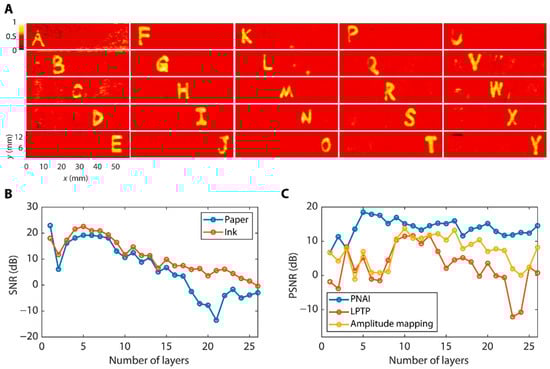 (a) THz images from 25 layers of letters written with black gel pen on paper present excellent consistency and high contrast. The proposed methodology named pulse neighborhood average imaging (PNAI) can eliminate letter superpositions, and the quality of the resulting THz images is comparable with that of optical images of the letter on single sheets of paper. Images are normalized separately with the mean value set to 0.4. (b) The estimated signal-to-noise ratio (SNR) of THz signals for each layer and (c) the evaluation of THz image quality using the peak SNR obtained by various imaging algorithms highlighting that the PNAI method provides a substantial improvement in image contrast. Reproduced under the terms of Creative Commons Attribution Non-Commercial License 4.0 from [78].