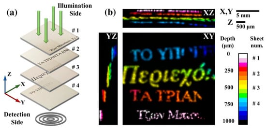 Photoacoustic imaging of a layered document with non-overlapping text; (a) representation of the sample; (b) photoacoustic images through top (XY) and side views (XZ; YZ). Reproduced with permission from [85];published by John Wiley & Sons Ltd., 2019.