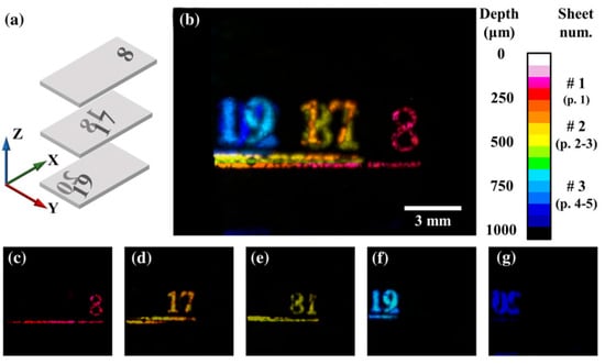 Photoacoustic imaging of a layered document with overlapping text; (a) representation of the sample; (b) top view of a photoacoustic image; (c–g) individual reconstructions of five sequential pages. Reproduced with permission from [85]; published by John Wiley & Sons Ltd., 2019.