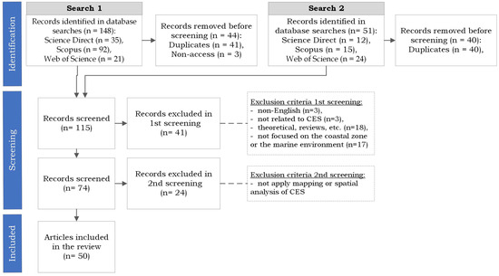 This systematic literature review was conducted following the Preferred Reporting Items for Systematic Reviews and Meta-Analyses (PRISMA) statement. The scientific papers were retrieved from the bibliographic databases “Science Direct”, “Scopus” and “Web of Sciences”. First, a search was performed for publications containing the keywords “cultural ecosystem services”, “cultural ecosystem values”, “intangible benefits”, and “non-material benefits” in combination with ‘marine/maritime spatial planning’ OR ‘coastal planning’ (Search 1, Table 1). Then, a second search was performed (Search 2, Table 1) to detect any additional coastal or marine participatory mapping-related papers. The last update of the search took place on 18 October 2023.
