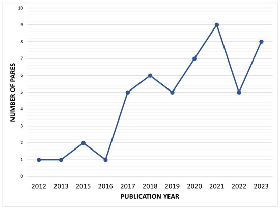 Ninety percent of the articles (Figure 2) were published from 2017 to 2023. There was a rapid rise in the number of publications from 2016 and 2019 and a rapid drop from 18% in 2021 to 10% in 2022. Articles were published in a range of scientific journals, among which almost 60% were the following: “Ocean and Coastal Management” (20%), “Ecosystem Services” (14%), “Journal of Environmental Management” (10%), “Marine Policy” (8%), and “Ecological Indicators” (8%). A total of 70% of the articles were authored by the scientific community, whilst 30% resulted from the collaboration between academics and government/authorities, or/and other organizations (e.g., NGOs or private companies) [10,53,54].