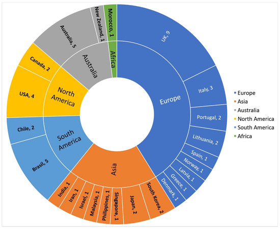 The spatial distribution of the papers is presented in Figure 3 and Figure 4. As seen in the graph, more than 46% were located in the NE Atlantic (21%), SW Atlantic (11%), NW Atlantic (7%), and the Baltic Sea (7%); 41% of the papers concerned Europe, 78% of which were in the United Kingdom (43%), Italy (15%), Lithuania (10%), and Portugal (10%). Another portion of papers (20%) was placed in Asia, whilst 14% were in South America (mainly in Brazil), 12% in North America, 12% in Australia, and 2% in Africa (Morocco).