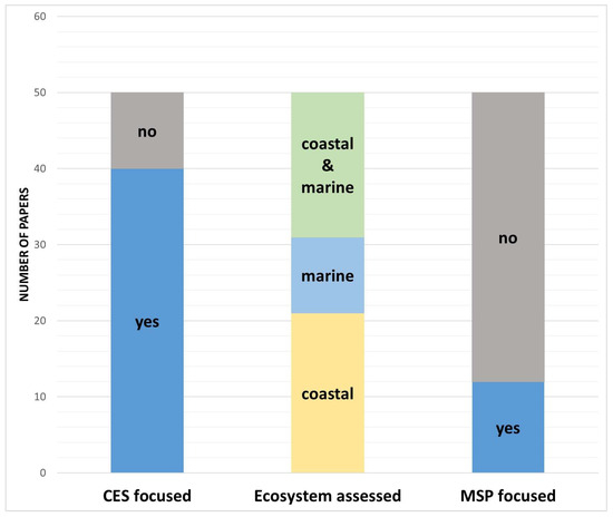Only 24% of the papers explicitly focused on MSP [24,44,70,71], concerning specific MSP-related fields like “incorporation of socio-cultural values and CES in MSP”, “recreation opportunities”, “tourism”, “marine biodiversity” “MPAs management”, “preservation of marine ES”, etc.