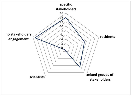 As displayed in Figure 6 below, a high percentage of the papers (70%) involved stakeholders in the assessment of CES, including 18% of residents [72], 28% of specific stakeholders, mainly recreational groups, residents, and tourists [73,74]; and 2% were scientists [10]. Finally, almost one quarter (22%) of the publications involved mixed groups of stakeholders [9,24,70,71], including Aboriginal Traditional Owners; residents; user groups and professionals; federal, state, and local government; or different groups of marine-related professionals.