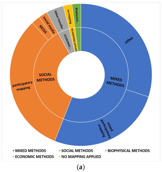 As observed in Figure 7a, almost 36% of the papers applied social methods (orange color); among them, 32% were participatory mapping approaches, and 4% used social media analysis [69] and multicriteria criteria analysis (MCA) [8] to map and assess CES. A relatively low percentage of the papers (6%) applied strictly economic (grey color) or biophysical methods (green color) [3,56,75], while 56% of the papers used mixed mapping approaches (blue color): 26% were mixed participatory mapping and 30% were other types of mixed mapping (e.g., InVEST or composite indicators). Finally, almost 2% of the papers (light orange color) did not apply mapping at all [76].