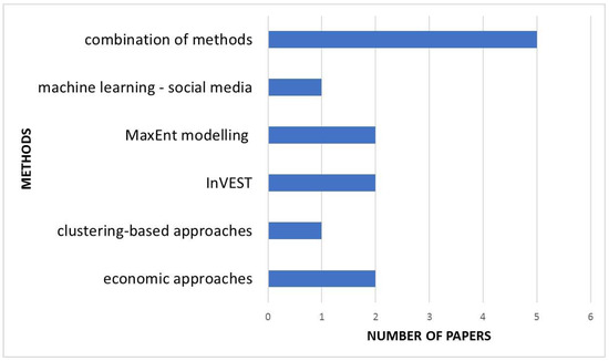 In Figure 7, the percentages for each mapping approach/method used are displayed. As already stated, the papers were classified following the key mapping approaches (biophysical methods, social methods, economic methods, and mixed methods) and were then further sub-categorized.